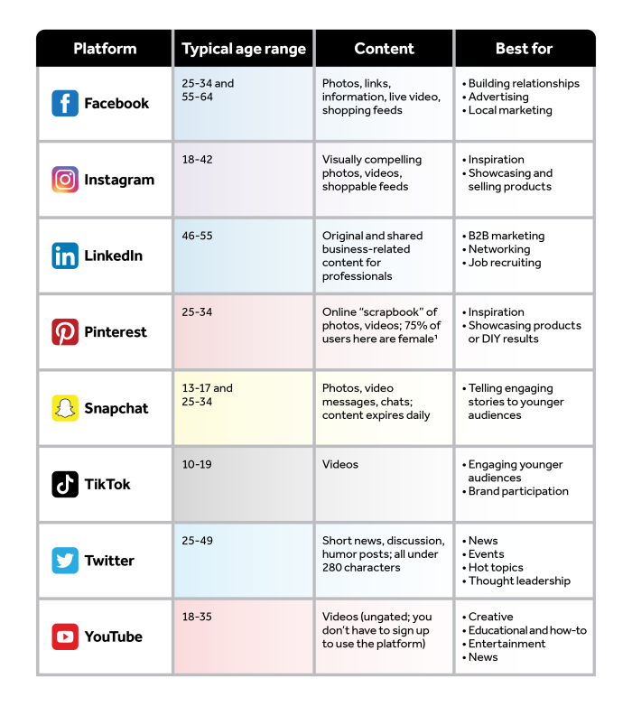 However…that doesn’t mean you need to be on every platform. That’s the social equivalent of throwing everything at the wall to see what sticks, and it can make for not only a messy wall, but an overwhelmed business owner as you try to keep up. To help you decide which social media platforms make the most sense for your business, let’s take a look at some platforms to consider.